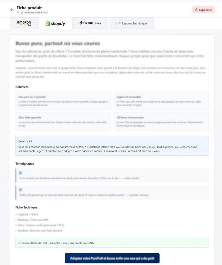 – Des fiches produits complètes optimisées pour Amazon FBA, Shopify et TikTok Shop, conformes aux contraintes de chaque plateforme