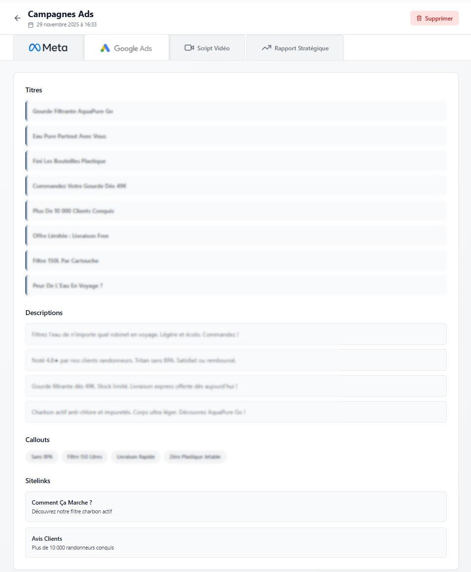 Chaque génération inclut un rapport stratégique complet, conçu pour répondre à différents besoins et styles : titres SEO, accroches, CTA et variantes selon plusieurs angles (émotion, conversion, storytelling…).