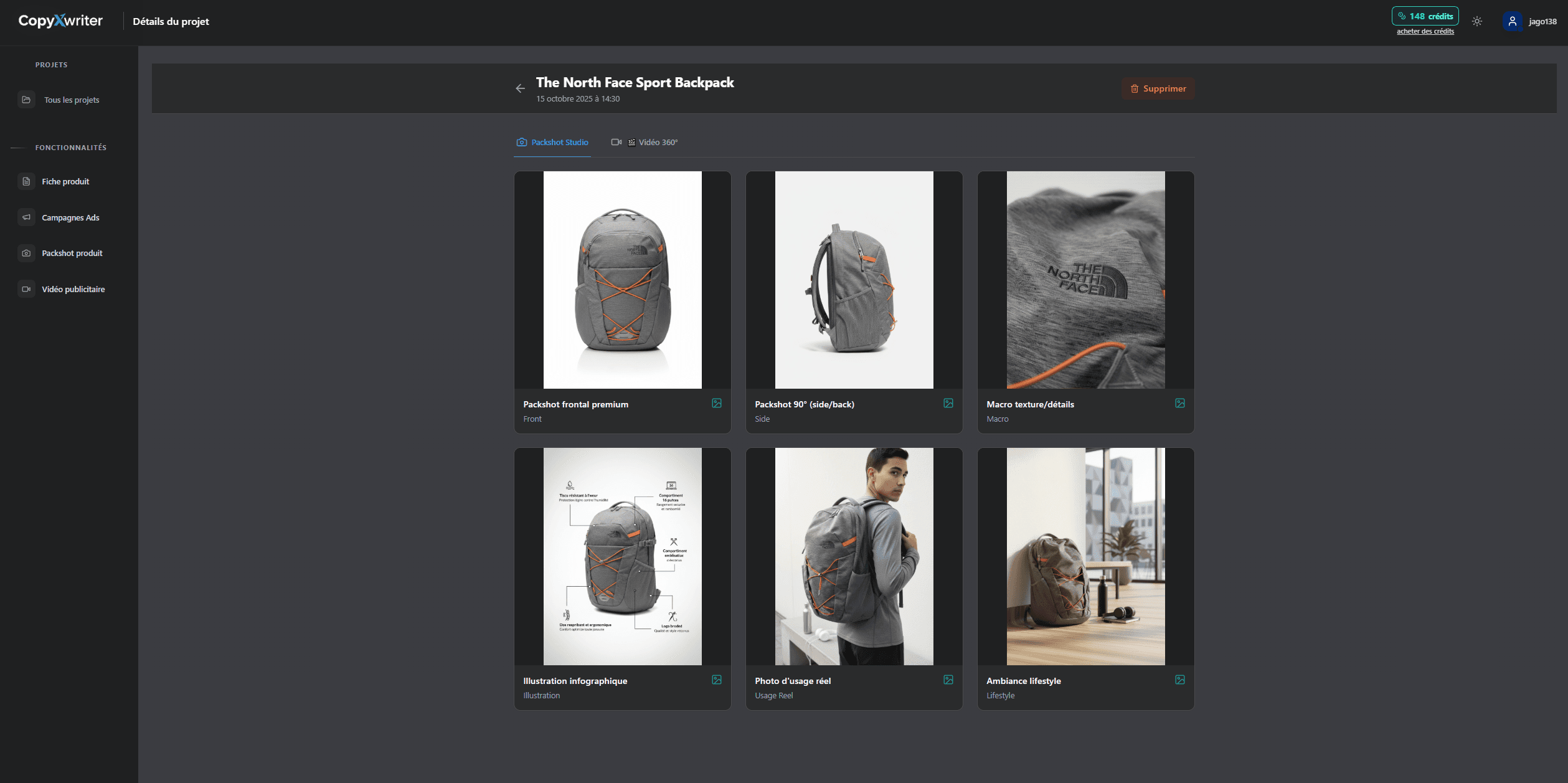 Le Pack Starter inclut 15 crédits utilisables à vie. C’est idéal pour tester CopyXwriter : avec 15 crédits, vous pouvez par exemple créer un packshot complet avec video 360°, une campagne Ads et deux fiches produits.
